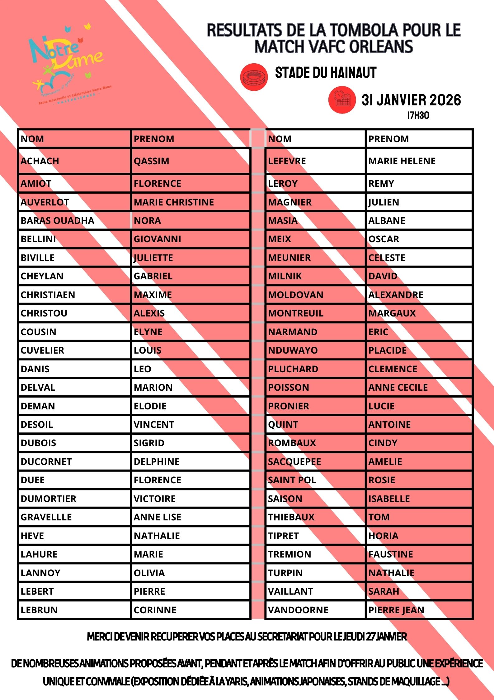 Affiche Journée Portes Ouvertes Rentrée École ND 2026 jpeg • 409 Ko Résultats tombola match de football Valenciennes Orléans du 31 janvier 2026 jpeg • 534 Ko Résultats Tombola pdf • 3 Mo